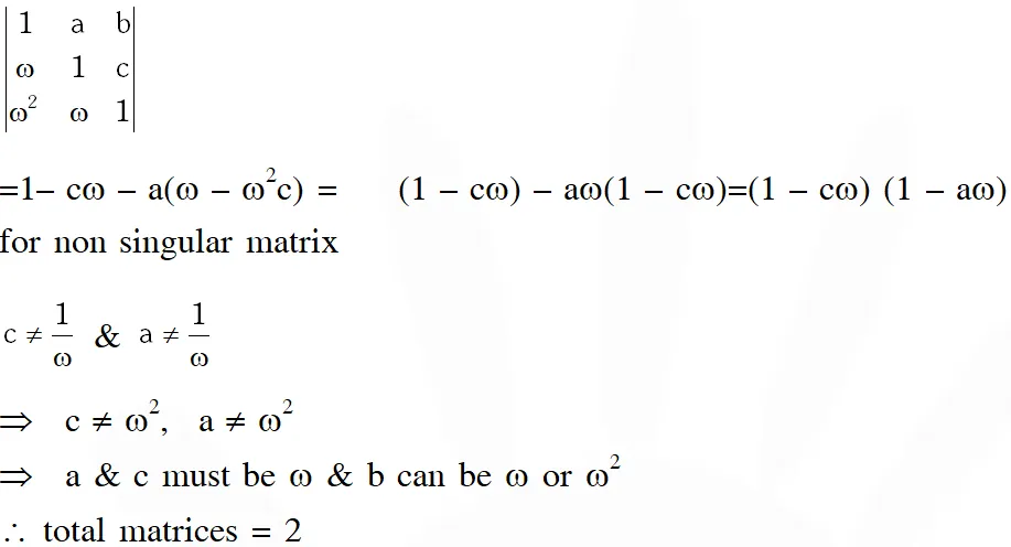 Q. Let $\omega \neq 1$ be a cube root of unity and $S$ be the set of all non-singular matrices of the form $\left[\begin{array}{lll}{1} & {a} & {b} \\ {\omega} & {1} & {c} \\ {\omega^{2}} & {\omega} & {1}\end{array}\right],$ where each of a,b and $c$ is either $\omega$ or $\omega^{2} .$ Then the number of distinct matrices in the set $\mathrm{S}$ is-
