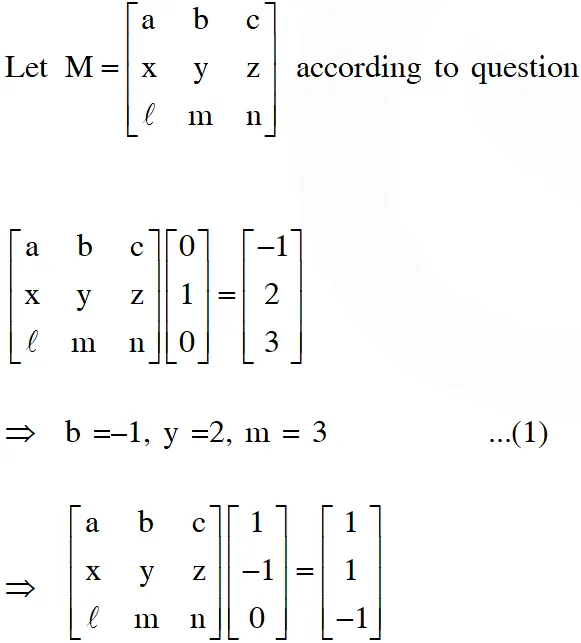 Q. Let M be 3 3 matrix satisfying $\mathbf{M}\left[\begin{array}{l}{0} \\ {1} \\ {0}\end{array}\right]=\left[\begin{array}{r}{-1} \\ {2} \\ {3}\end{array}\right], \mathbf{M}\left[\begin{array}{c}{1} \\ {-1} \\ {0}\end{array}\right]=\left[\begin{array}{r}{1} \\ {1} \\ {-1}\end{array}\right]$ and $\mathbf{M}\left[\begin{array}{l}{1} \\ {1} \\ {1}\end{array}\right]=\left[\begin{array}{c}{0} \\ {0} \\ {12}\end{array}\right]$ Then the sum of the diagonal entries of M is