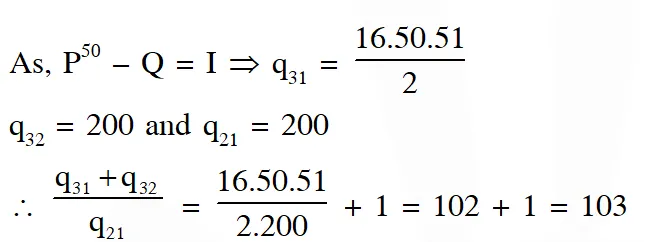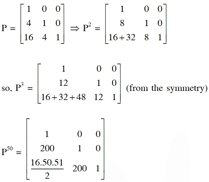 Q. Let $P=\left[\begin{array}{lll}{1} & {0} & {0} \\ {4} & {1} & {0} \\ {16} & {4} & {1}\end{array}\right]$ and $I$ be the identity matrix of order $3 .$ If $Q=\left[q_{i j}\right]$ is a matrix such that $\mathrm{P}^{50}-\mathrm{Q}=\mathrm{I},$ then $\frac{\mathrm{q}_{31}+\mathrm{q}_{32}}{\mathrm{q}_{21}}$ equals