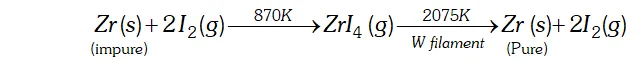 Ans. The impure metal (Ti or Zr) is first converted into its volatile ¡odide by heating with $I_{2}$ at some low temperature and then decomposing the volatile iodide at a suitable high temperature to give the pure metal. For example,