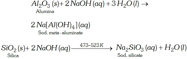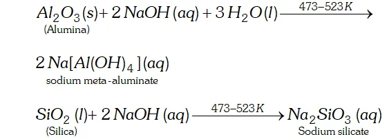 titanium oxide $\left(T i O_{2}\right)$ as impurities. These impurities can be removed by the process of leaching. During leaching, the powdered bauxite ore is heated with a concentrated $(45 \%)$ solution of $N a O H$ at $473-523 K,$ when alumina dissolves as sodium meta-aluminate and silica $\left(\mathrm{Si} \mathrm{O}_{2}\right)$ as sodium silicate leaving the impurities behind.