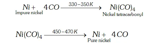 Ans. Mond process: It is used for refining of nickel. When impure nickel is heated in a current of $C O$ at $330-350 K,$ it forms volatile nickel tetracarbonyl complex leaving behind the impurities. The nickel tetracarbonyl thus obtained is then heated to a higher temperature $(450-470 K)$ when it undergoes thermal decomposition giving pure nickel