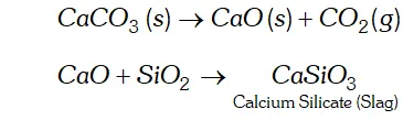 $\mathrm{CaCO}_{3} \rightarrow \mathrm{CaO}+\mathrm{CO}_{2} ; \mathrm{CaO}+\mathrm{SiO}_{2} \rightarrow \mathrm{CaSiO}_{3}(\mathrm{slag})$
