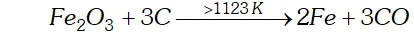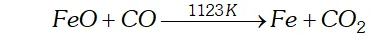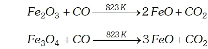 (iv) Zone of reduction: This is the upper part of the furnace. The temperature here is around $823 \mathrm{K} .$ Here the ores are reduced to $\mathrm{FeOby} \mathrm{CO}$