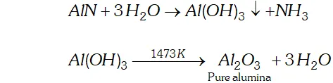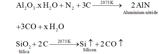 an atmosphere of $N_{2}$ gas. Alumina combines with to form aluminium nitride while silica is reduced to silicon which volatilizes off at this temperature.