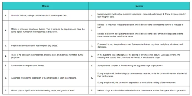 Question 11: List the main differences between mitosis and meiosis.