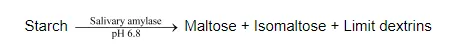 As food enters the mouth, it gets mixed with saliva. Saliva - secreted by the salivary glands - contains a digestive enzyme called salivary amylase. This enzyme breaks down starch into sugar at $\mathrm{pH} 6.8$