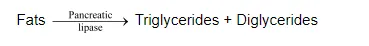 Diglycerides and monoglycerides $\stackrel{\text { Lipases }}{\longrightarrow}$ Fatty acids + Glycerol