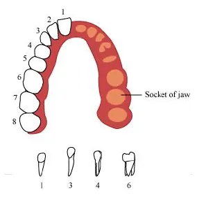 Each half of the upper jaw and the lower jaw has 2 incisors, 1 canine, and 2 molars. Premolars are absent in milk teeth.