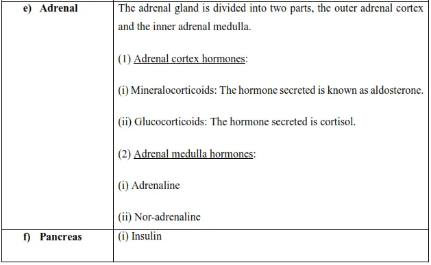 Question 3. List the hormones secreted by the following: Solution. (a) Hypothalamus (b) Pituitary (c) Thyroid (d) Parathyroid (e) Adrenal (f) Pancreas