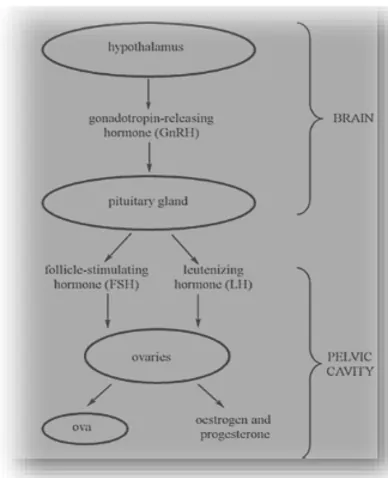 - In females, FSH stimulates the growth and maturation of ovarian follicle. As the follicle grows and matures, the granulosa cells of the ovarian follicles in the ovaries release an inhibitory hormone known as inhibin that suppresses the process of FSH production.