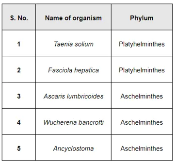 Solution. Taenia (Tapeworm) and Fasciola (liver fluke) are examples of parasitic platyhelminthes.