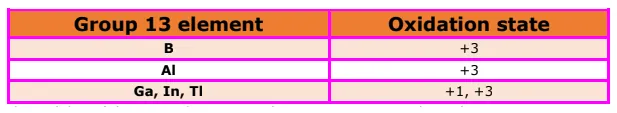 The electric configuration of group 13 elements is $n s^{2} n p^{1}$. Therefore, the most common oxidation state exhibited by them should be $+3$. However, it is only boron and aluminium which practically show the $+3$ oxidation state. The remaining elements, i.e., Ga, In, $T$, show both the $+1$ and $+3$ oxidation states. On moving down the group, the $+1$ state becomes more stable. For example, $T 1(+1)$ is more stable than $\mathrm{Tl}(+3)$. This is because of the inert pair effect. The two electrons present in the s-shell are strongly attracted by the nucleus and do not participate in bonding. This inert pair effect becomes more and more prominent on moving down the group. Hence, Ga $(+1)$ is unstable, In $(+1)$ is fairly stable, and $\mathrm{TI}(+1)$ is very stable.