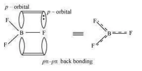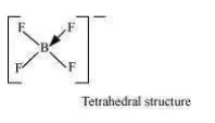 This double-bond character causes the bond length to shorten in $\mathrm{BF}_{3}(130 \mathrm{pm}) .$ However, when BFa coordinates with the fluoride ion, a change in hybridisation from $s p^{2}$ (in BF 3 ) to $s p^{3}$ (in $B F_{4}^{-}$ ) occurs. Boron now forms $4 \sigma$ bonds and the double-bond character is lost. This accounts for a B-F bond length of $143 \mathrm{pm}$ in $B F_{4}^{-}$ ion.