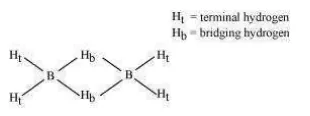 2 boron and 4 terminal hydrogen atoms $(\mathrm{Ht})$ lie in one plane, while the other two bridging hydrogen atoms $\left(\mathrm{H}_{\mathrm{b}}\right)$ lie in a plane perpendicular to the plane of boron atoms. Again, of the two bridging hydrogen atoms, one $\mathrm{H}$ atom lies above the plane and the other lies below the plane. The terminal bonds are regular two-centre two-electron $\left(2 c-2 e^{-}\right)$ bonds, while the two bridging $(\mathrm{B}-\mathrm{H}-\mathrm{B})$ bonds are three-centre two-electron $\left(3 \mathrm{c}-2 \mathrm{e}^{-}\right)$ bonds.