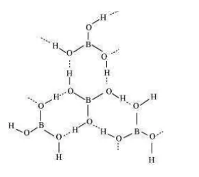 Boric acid has a layered structure. Each planar $\mathrm{BO}_{3}$ unit is linked to one another through $\mathrm{H}$ atoms. The $\mathrm{H}$ atoms form a covalent bond with a $\mathrm{BO}_{3}$ unit, while a hydrogen bond is formed with another $\mathrm{BO}_{3}$ unit. In the given figure, the dotted lines represent hydrogen bonds.
