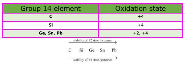 The electronic configuration of group 14 elements is $n s^{2} n p^{2}$. Therefore, the most common oxidation state exhibited by them should be $+4$. However, the $+2$ oxidation state becomes more and more common on moving down the group. $\mathrm{C}$ and $\mathrm{Si}$ mostly show the $+4$ state. On moving down the group, the higher oxidation state becomes less stable. This is because of the inert pair effect. Thus, although $\mathrm{Ge}, \mathrm{Sn}$, and $\mathrm{Pb}$ show both the $+2$ and $+4$ states, the stability of the lower oxidation state increases and that of the higher oxidation state decreases on moving down the group.