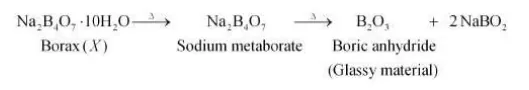 Solution. The given salt is alkaline to litmus. Therefore, $X$ is a salt of a strong base and a weak acid. Also, when $X$ is strongly heated, it swells to form substance $Y$. Therefore, $X$ must be borax. When borax is heated, it loses water and swells to form sodium metaborate. When heating is continued, it solidifies to form a glassy material $Y$. Hence, $Y$ must be a mixture of sodium metaborate and boric anhydride.