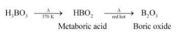 Solution. On heating orthoboric acid $\left(\mathrm{H}_{3} \mathrm{BO}_{3}\right)$ at $370 \mathrm{~K}$ or above, it changes to metaboric acid $\left(\mathrm{HBO}_{2}\right)$.