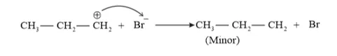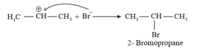 Secondary carbocations are more stable than primary carbocations. Hence, the former predominates since it will form at a faster rate. Thus, in the next step, $\mathrm{Br}^{-}$ attacks the carbocation to form 2 -bromopropane as the major product.