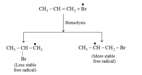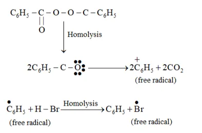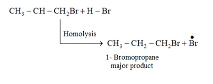 Question 16. Addition of $\mathrm{HBr}$ to propene yields 2 -bromopropane, while in the presence of benzoyl peroxide, the same reaction yields 1-bromopropane. Explain and give mechanism.