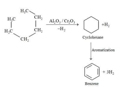 When alkene (carbon contain 6 or more than 6 ) heated at hight temperature and high pressure inpresence of $\mathrm{Al}_{2} \mathrm{O}_{3}, \mathrm{Cr}_{2} \mathrm{O}_{3}$ undergoes aromatization.