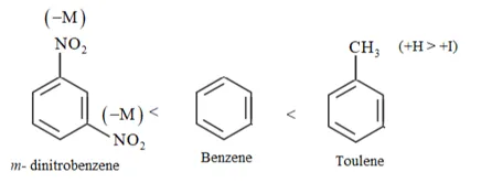 On the other hand, $\mathrm{m}$ - Dinitrobenzene will have the least electron density. Hence, it will undergo nitration with difficulty. Hence, the increasing order of nitration is as follows: