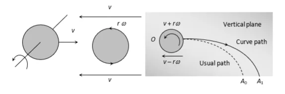 The resultant velocity of air above the ball will be $(v+r \omega)$ while below it $(v-r \omega)$. So. in accordance with Bernoulli's principal pressure above the ball will be less than below it. Due to this difference of pressure, an upward force will act on the ball, and hence the ball will deviate from its usual path $O A_{0}$ and will hit the ground at $A_{1}$ following the path $O A_{1}$,