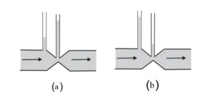 (c) The small opening of a syringe needle controls the velocity of the blood flowing out. It follows the equation of continuity. At the constriction point of the syringe system, the flow rate suddenly increases to a high value for a constant thumb pressure applied.