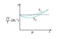 Solution. (a) The dotted plot in the graph signifies the ideal behaviour of the gas, i.e., the ratio $\frac{P V}{T}$ is equal. $\mu R$ ( $\mu$ is the number of moles and $R$ is the universal gas constant) is a constant quality. It is not dependent on the pressure of the gas