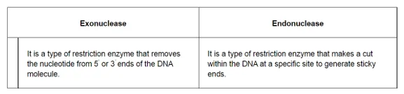 (i) Exonuclease - It is a type of restriction enzyme that removes the nucleotide from either 5 ' or 3 ends of the DNA molecule.