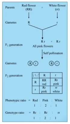Incomplete dominance is a phenomenon in which one allele shows incomplete dominance over the other member of the allelic pair for a character. For example, a monohybrid cross between the plants having red flowers and white flowers in Antirrhinum species will result in all pink flower plants in $\mathrm{F}_{1}$ generation. The progeny obtained in $\mathrm{F}_{1}$ generation does not resemble either of the parents and exhibits intermediate characteristics. This is because the dominant allele, $R$, is partially dominant over the other allele, r. Therefore, the recessive allele, $r$, also gets expressed in the $F_{1}$ generation resulting in the production of intermediate pink flowering progenies with Rr genotype.