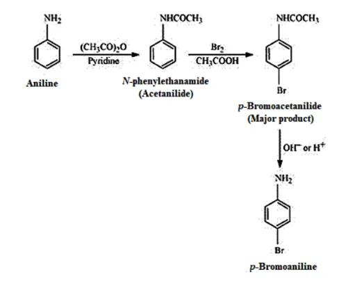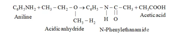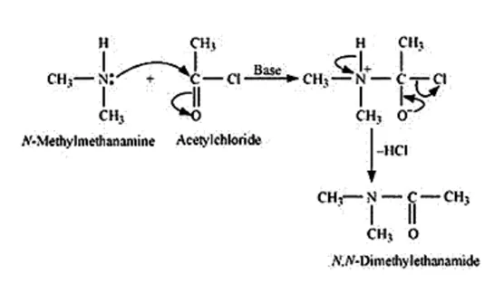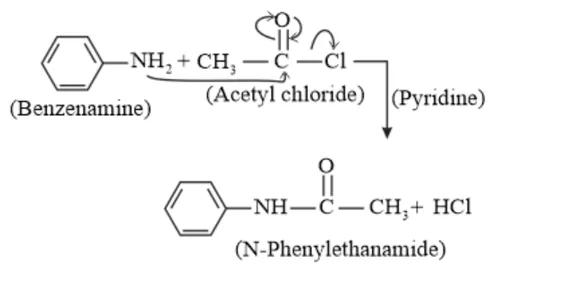 Aliphatic and aromatic primary and secondary amines undergo acetylation reaction by nucleophilic substitution when treated with acid chlorides, anhydrides or esters. This reaction involves the replacement of the hydrogen atom of $-\mathrm{NH}_{2}$ or $>$ NH group by the acetyl group, which in turn leads to the production of amides. To shift the equilibrium to the right-hand side, the HCl formed during the reaction is removed as soon as it is formed. This reaction is carried out in the presence of a base (such as pyridine) which is stronger than the amine.