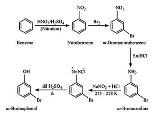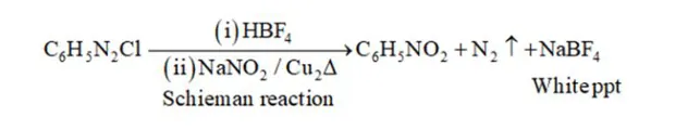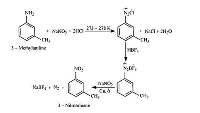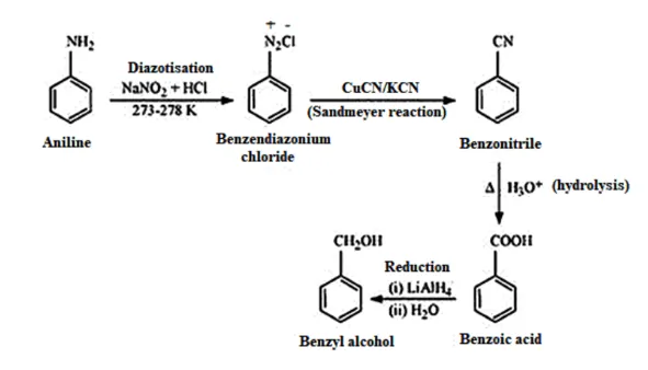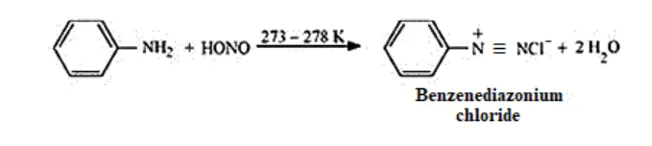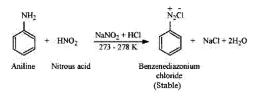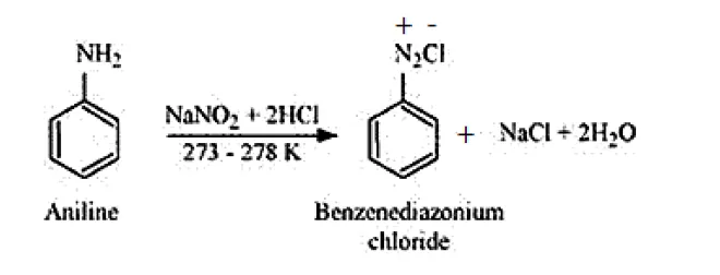 For example, on treatment with $\mathrm{NaNO}_{2}$ and $\mathrm{HCl}$ at $273-278 \mathrm{~K}$, aniline produces the compound benzene diazonium chloride, with $\mathrm{NaCl}$ and $\mathrm{H}_{2} \mathrm{O}$ as by-products.