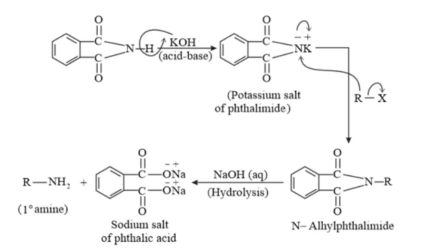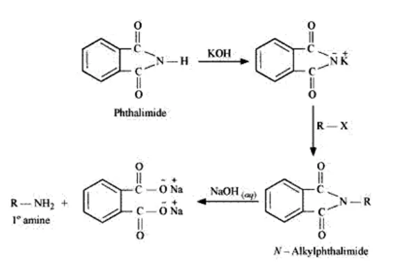 Gabriel phthalimide synthesis is a very useful method for the preparation of aliphatic primary amines. It involves the treatment of phthalimide with ethanolic potassium hydroxide to form potassium salt of phthalimide. This salt is further heated with an alkyl halide, followed by alkaline hydrolysis to yield the corresponding primary amine.