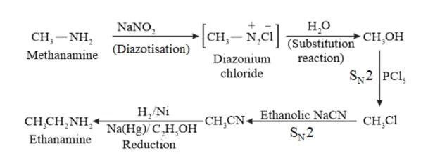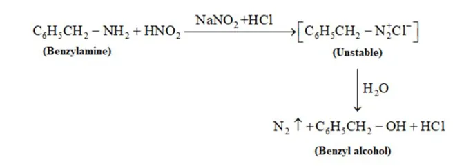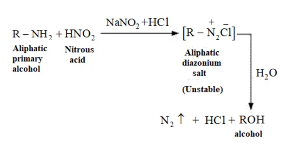 (ii) Aliphatic primary amines react with nitrous acid (prepared in situ from $\mathrm{NaNO}_{2}$ and a mineral acid such as $\mathrm{HCl}$ ) to form unstable aliphatic diazonium salts, which further produce alcohol and $\mathrm{HCl}$ with the evolution of $\mathrm{N}_{2}$ gas.