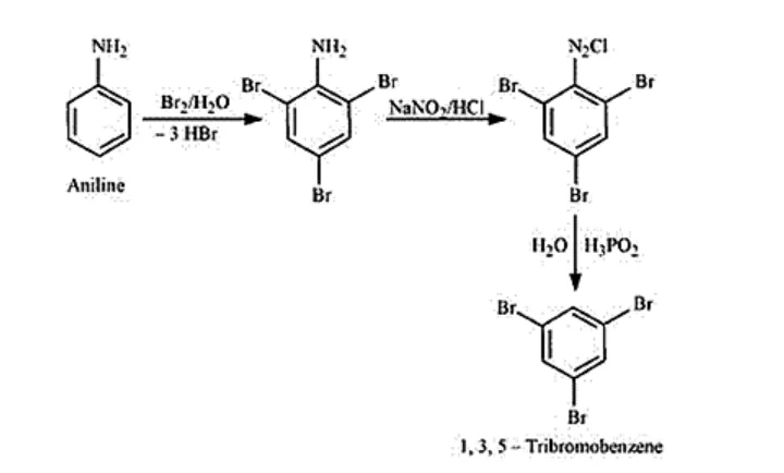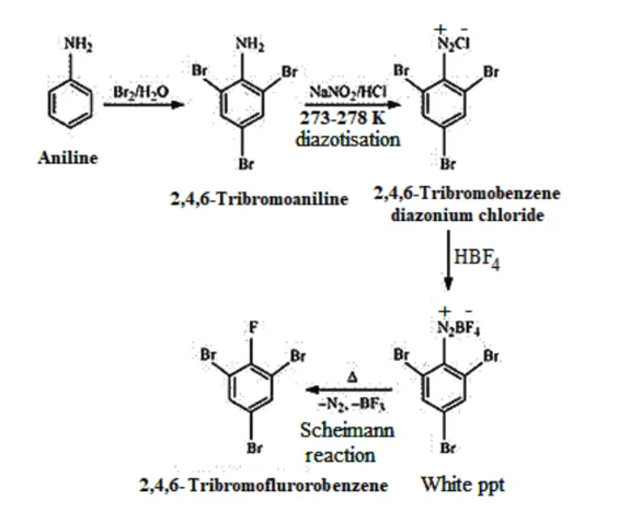 (iv) Aniline to 2,4,6 −tribromofluorobenzene