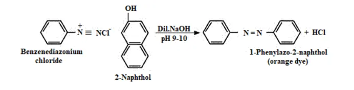 Dil $\mathrm{NaOH}$ at $p H=8.5$ to $9.5$ reacts with $-H$ of phenol group. Due to this phenoxide ion is formed. It activates the ring. When the phenoxide ion reacts with a diazonium salt, it results in the formation of azo dye. This reaction is called coupling reaction.