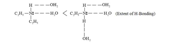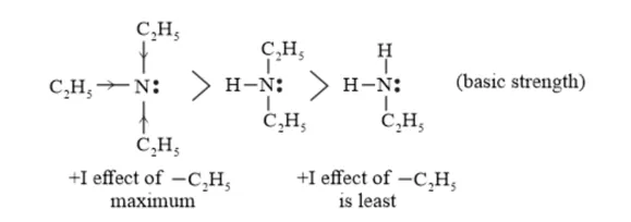 Due to $+\mathrm{I}$ effect $-\mathrm{C}_{2} \mathrm{H}_{5}$ the basic character should be $\left.\left(\mathrm{C}_{2} \mathrm{H}_{5}\right)_{3} \mathrm{~N}\right\rangle$ $\left(\mathrm{C}_{2} \mathrm{H}_{5}\right)_{2} \mathrm{NH}>\mathrm{C}_{2} \mathrm{H}_{5} \mathrm{NH}_{2}$ in the gaseous phase. But in aqueous state hydrogen bonding is also taking place and extent of hydrogen bonding is $1^{\circ}>2^{\circ}>3^{\circ}$ amine