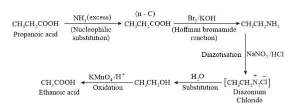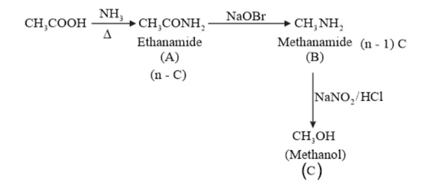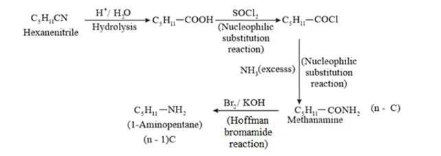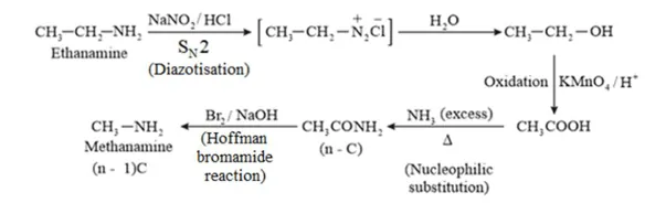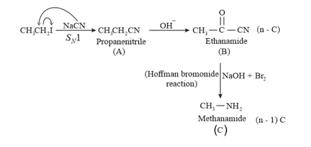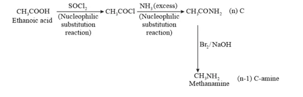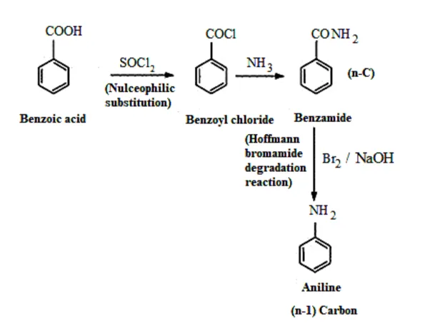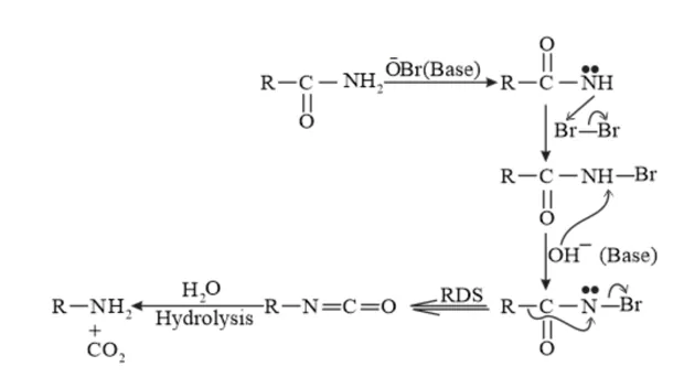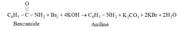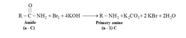 When an amide is treated with bromine in an aqueous or ethanolic solution of sodium hydroxide, a primary amine with one carbon atom less than the original amide is produced. This degradation reaction is known as Hoffmann bromamide reaction. This reaction involves the migration of an alkyl or aryl group from the carbonyl carbon atom of the amide to the nitrogen atom.
