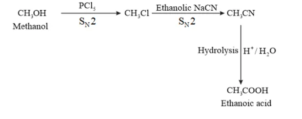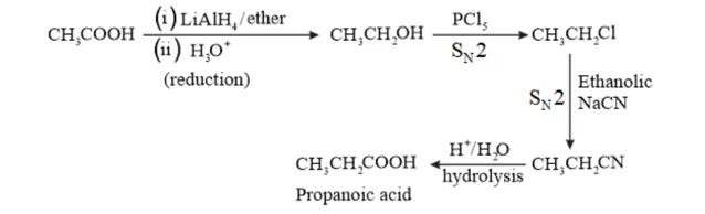 (i) $\mathrm{CH}_{3} \mathrm{CH}_{2} \mathrm{I} \stackrel{\mathrm{NaCN}}{\longrightarrow} \mathrm{A} \frac{\mathrm{OH}^{-}}{\text {Parual hydrolysts }}{\longrightarrow} \mathrm{B} \stackrel{\mathrm{NaOH}+\mathrm{Br}_{2}}{\longrightarrow} \mathrm{C}$