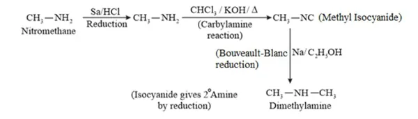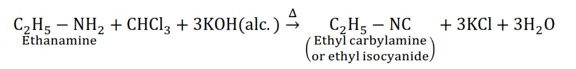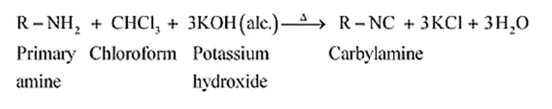 Carbylamine reaction is used as a test for the identification of primary amines. When aliphatic and aromatic primary amines are heated with chloroform $\left(\mathrm{CHCl}_{3}\right)$ and ethanolic potassium hydroxide (KOH), carbylamines (or isocyanides) are formed. These carbylamines have very unpleasant odours. Secondary and tertiary amines do not respond to this test.