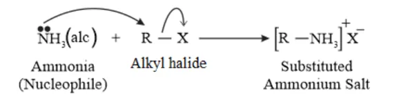 When an alkyl or benzyl halide is reacted with an ethanolic solution of ammonia, it undergoes nucleophilic substitution reaction in which the halogen atom is replaced by an amino group $\left(-\mathrm{NH}_{2}\right)$. This process of cleavage of the carbon-halogen bond is known as ammonolysis.