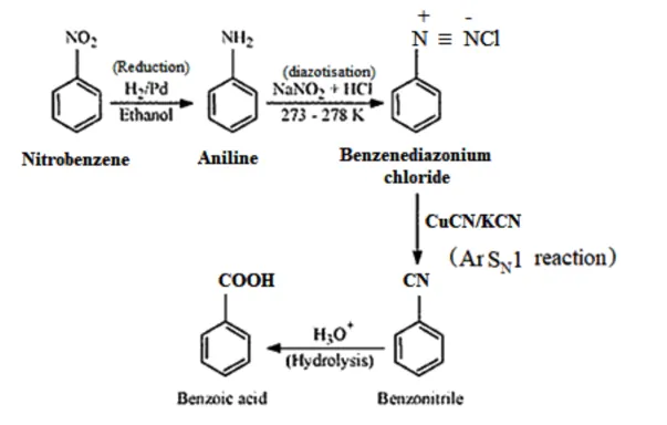 In the next step nitrobenzene is reduced by $\mathrm{H}_{2} / \mathrm{Pd}$ to aniline.
