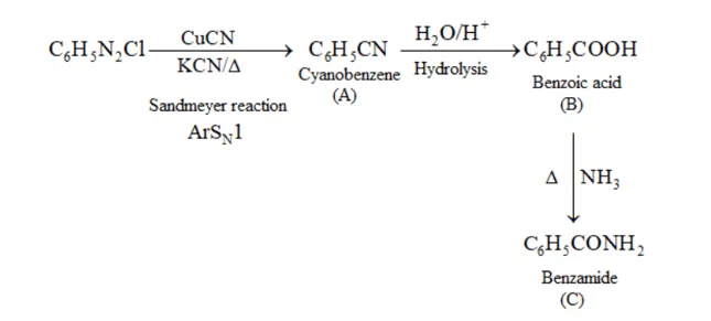 (ii) $\mathrm{C}_{6} \mathrm{H}_{5} \mathrm{~N}_{2} \mathrm{Cl} \stackrel{\mathrm{CuCN}}{\longrightarrow} \mathrm{A} \stackrel{\mathrm{H}_{2} \mathrm{O} / \mathrm{H}^{+}}{\longrightarrow} \mathrm{B} \frac{\mathrm{NH}_{3}}{\Delta} \longrightarrow \mathrm{C}$