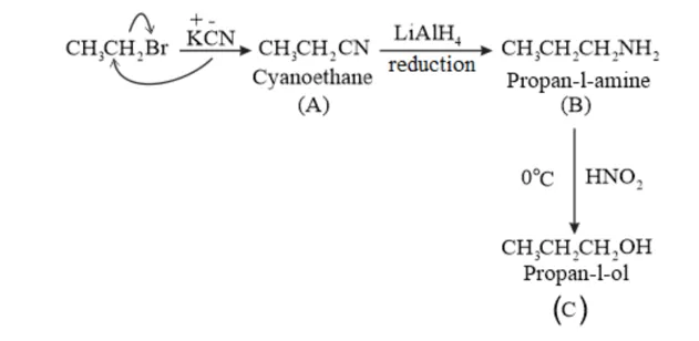 (iii) $\mathrm{CH}_{3} \mathrm{CH}_{2} \mathrm{Br} \stackrel{\mathrm{KCN}}{\longrightarrow} \mathrm{A} \stackrel{\mathrm{LAH}_{4}}{\longrightarrow} \mathrm{B} \frac{\mathrm{HNO}_{2}}{\mathrm{O}^{\circ} \mathrm{C}} \longrightarrow \mathrm{C}$