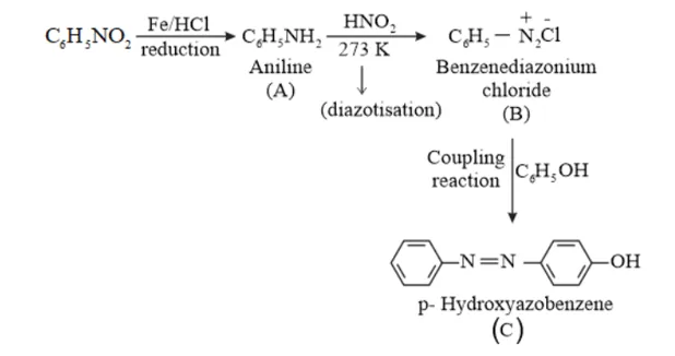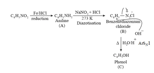 (iv) $\mathrm{C}_{6} \mathrm{H}_{5} \mathrm{NO}_{2} \stackrel{\mathrm{Fe} / \mathrm{HCl}}{\longrightarrow} \mathrm{A} \frac{\mathrm{NaNO}_{2}+\mathrm{HCl}}{273 \mathrm{~K}} \longrightarrow \mathrm{B} \frac{\mathrm{H}_{2} \mathrm{O} / \mathrm{H}^{*}}{\Delta} \longrightarrow \mathrm{C}$