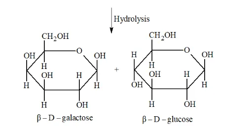 Solution. Lactose is a disaccharide carbohydrate composed of $\beta-$ D galactose and $\beta-D$ glucose units. Thus, on hydrolysis, it gives $\beta-$ D galactose and $\beta-D$ glucose due to the breaking of the glycosidic bond.