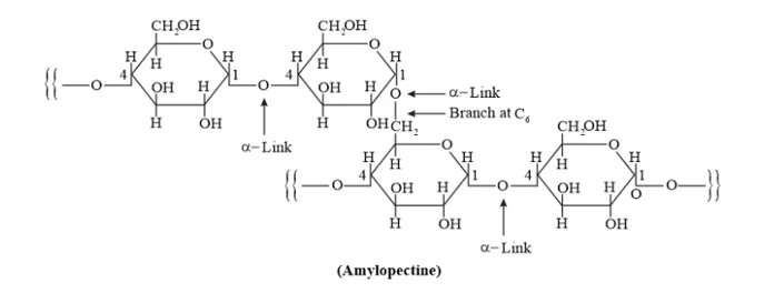Amylopectin is a branched-chain polymer of $\alpha$-D-glucose units, in which the chain is formed by $C 1-C 4$ glycosidic linkage and the branching occurs through $C 1-C 6$ glycosidic linkage.