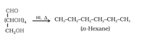 Solution. (i) When D-glucose is heated with HI for a long time, n-hexane is formed. This shows that all the six-carbon atoms are linked in a straight chain.